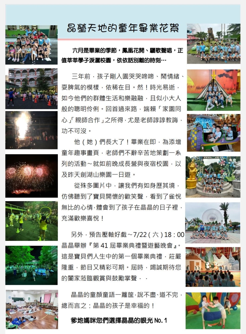 「啟蒙幼教是良心教育」晶晶四十餘年來,給孩子們『最好的』是一向堅持不變的辦學原則。親愛家長珍愛寶貝的童年,優質學習環境、有口皆碑的『晶晶』是唯一的好選擇。